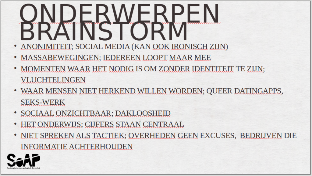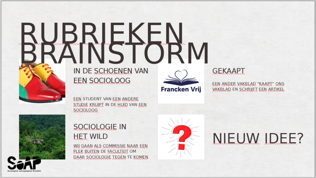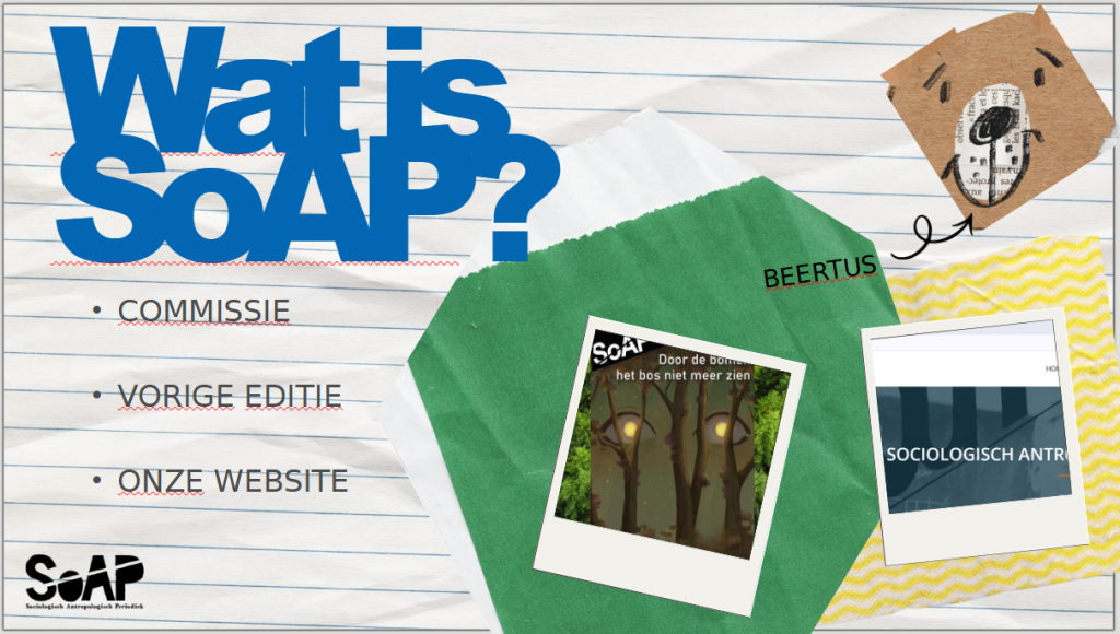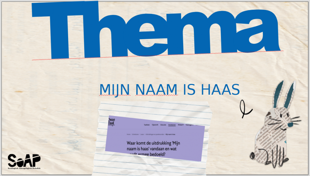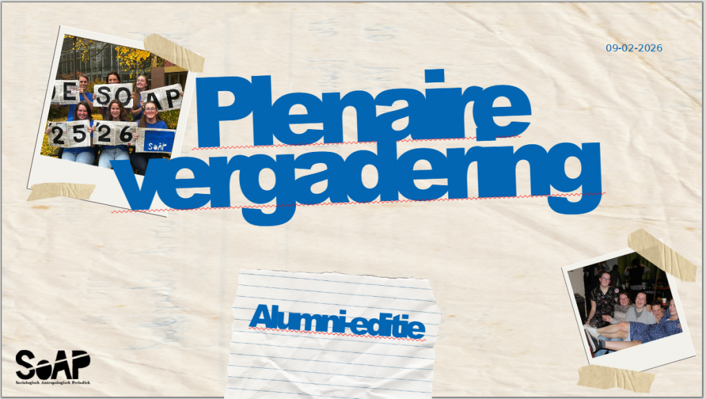 9 februari heeft de SoAP een plenaire vergadering gehouden over de aankomende alumni-editie. Het onderwerp van die editie wordt ‘Mijn naam is haas’. Deze presentatie zou ook als inspiratie kunnen dienen, mocht er nog animo zijn om voor de nieuwe alumni-editie te schrijven. De deadline voor het geschreven stuk inleveren is 20 april 2026.